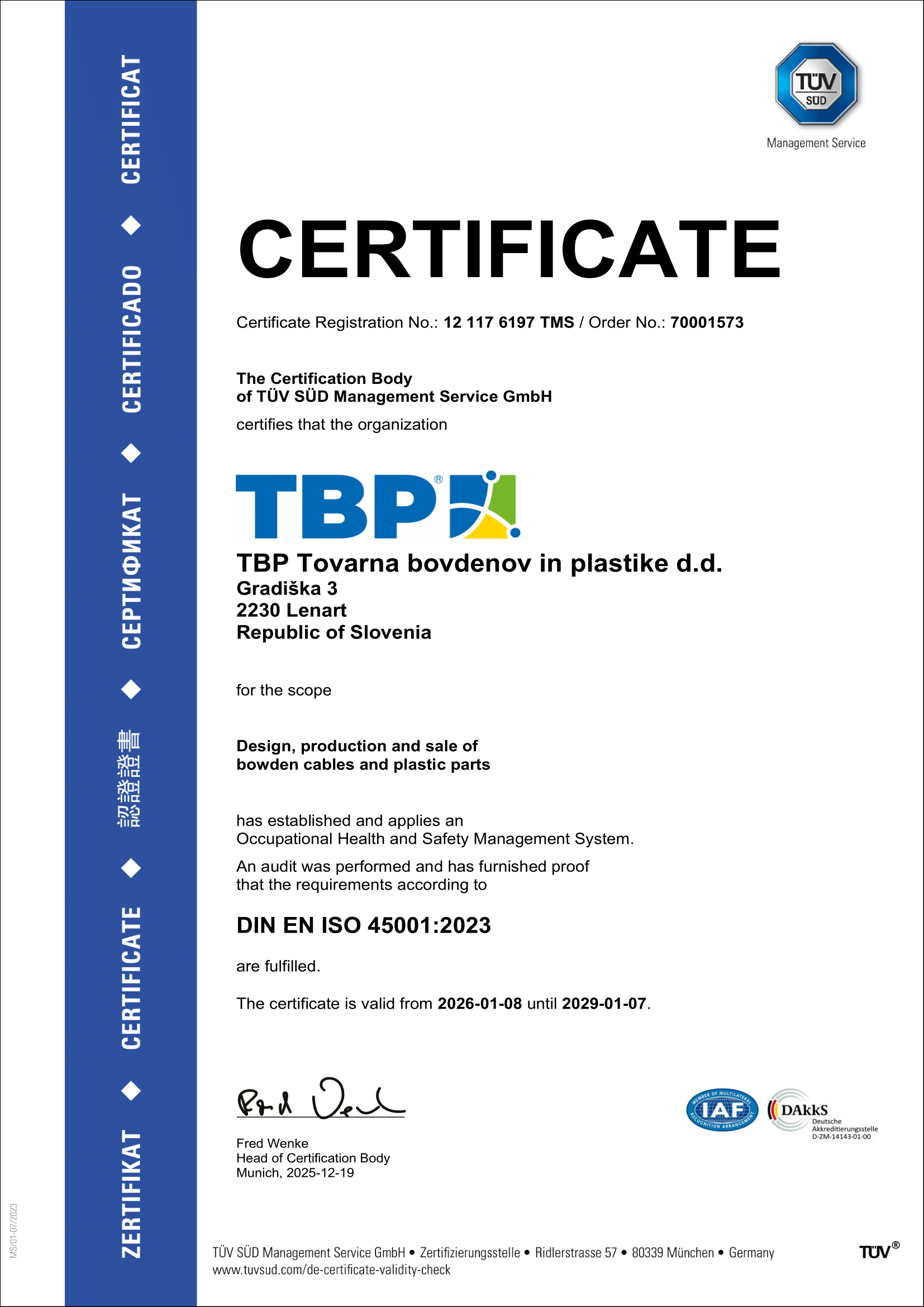 TBP’s quality management system conforms to SIST EN ISO 9001 quality management standard,